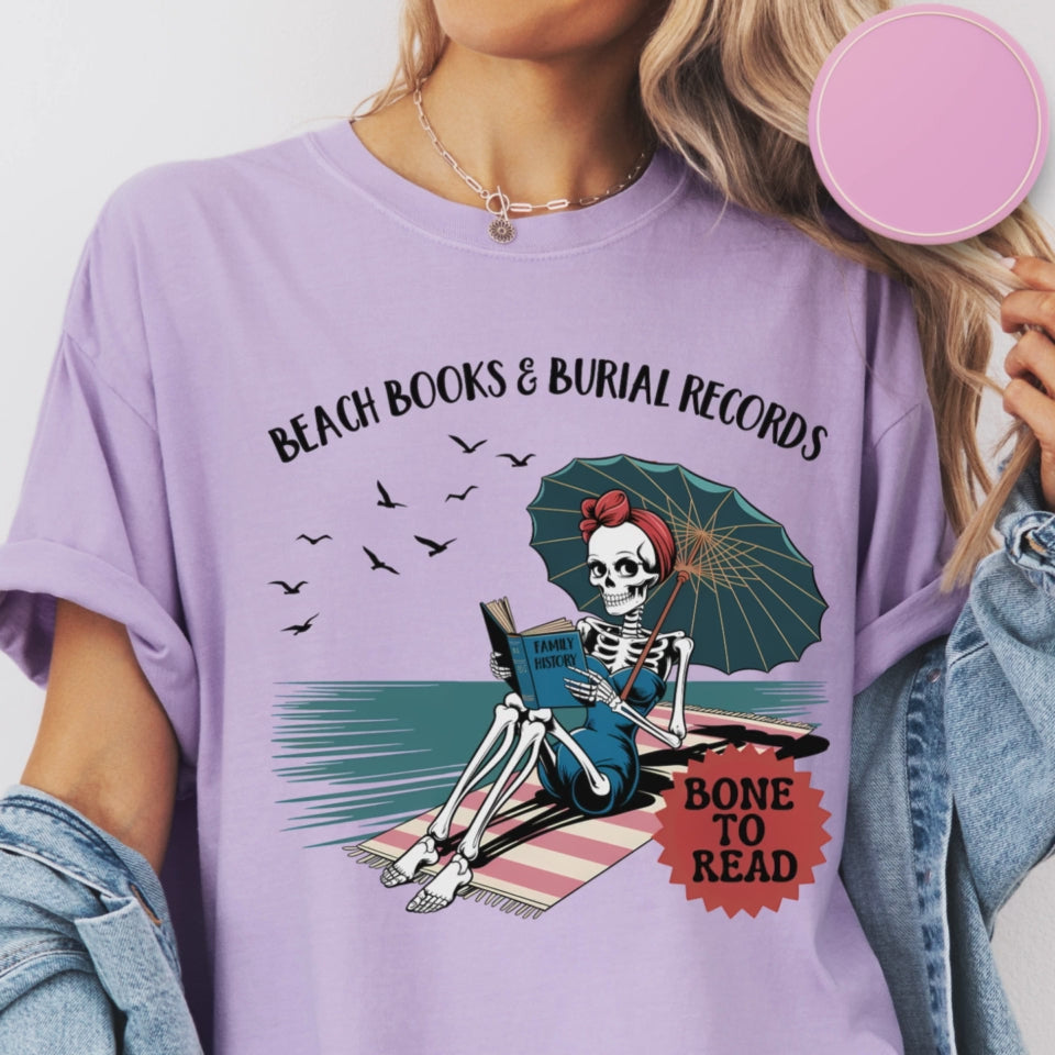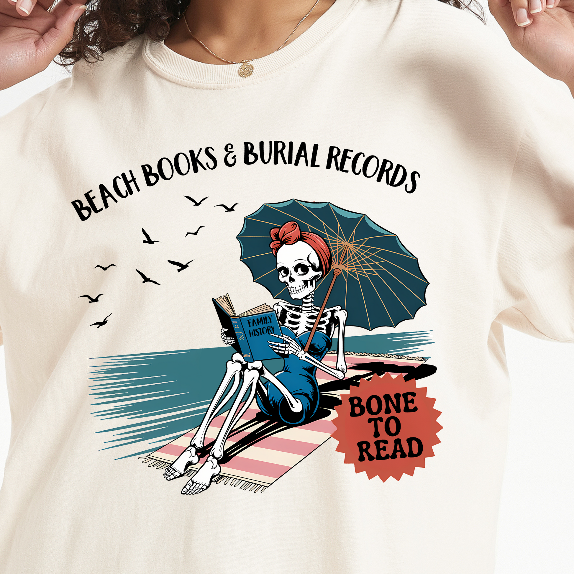 Show off your spooky family history obsession with this retro âBeach, Books & Burial Recordsâ skeleton tee!