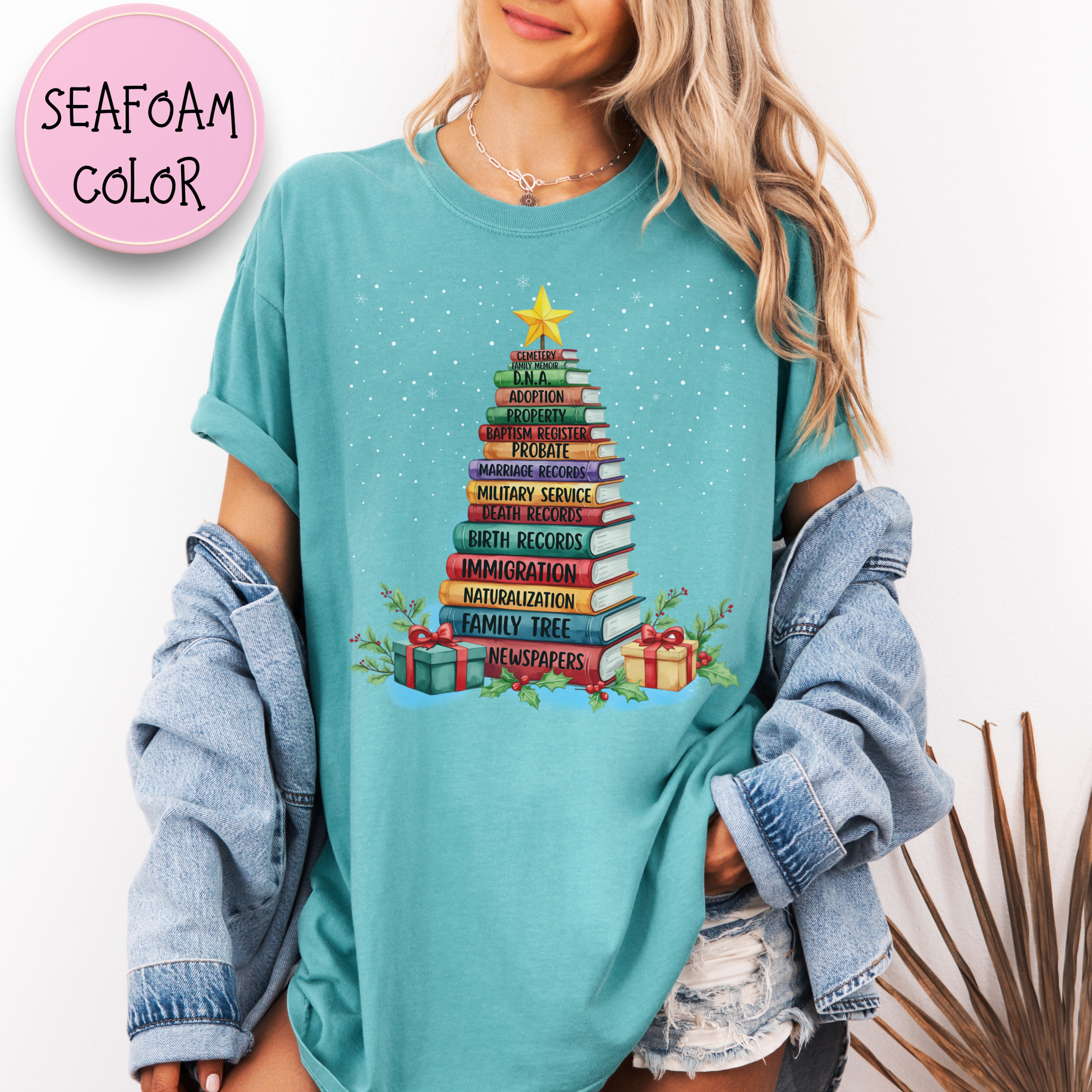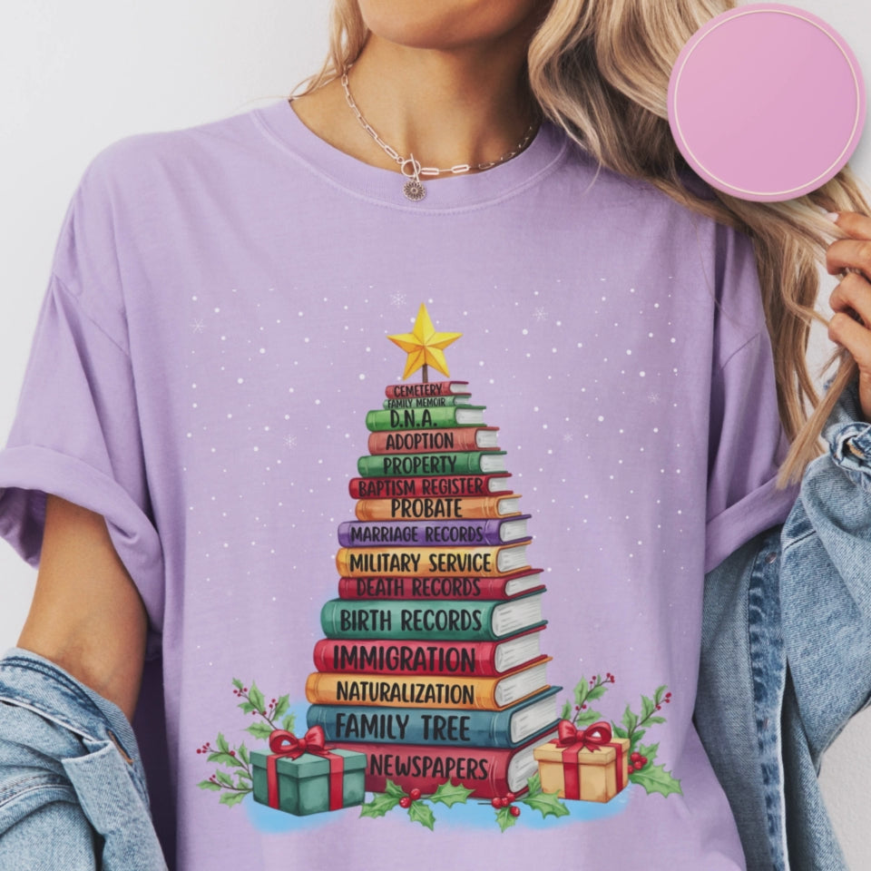 This festive genealogy tee features a Christmas tree made entirely from family history recordsāDNA, census, birth, death, immigration, and more!