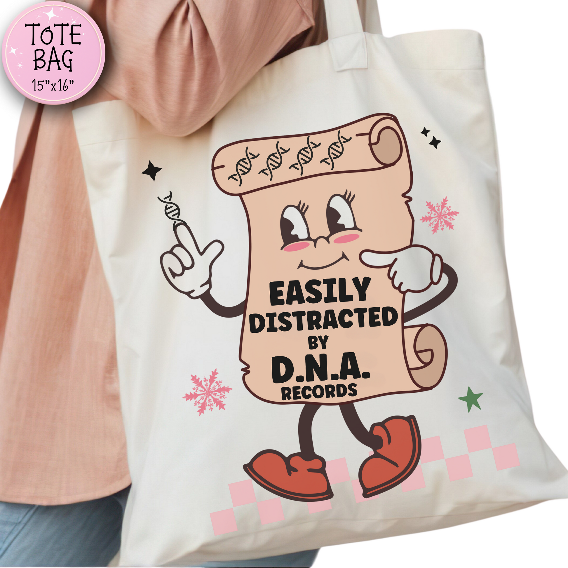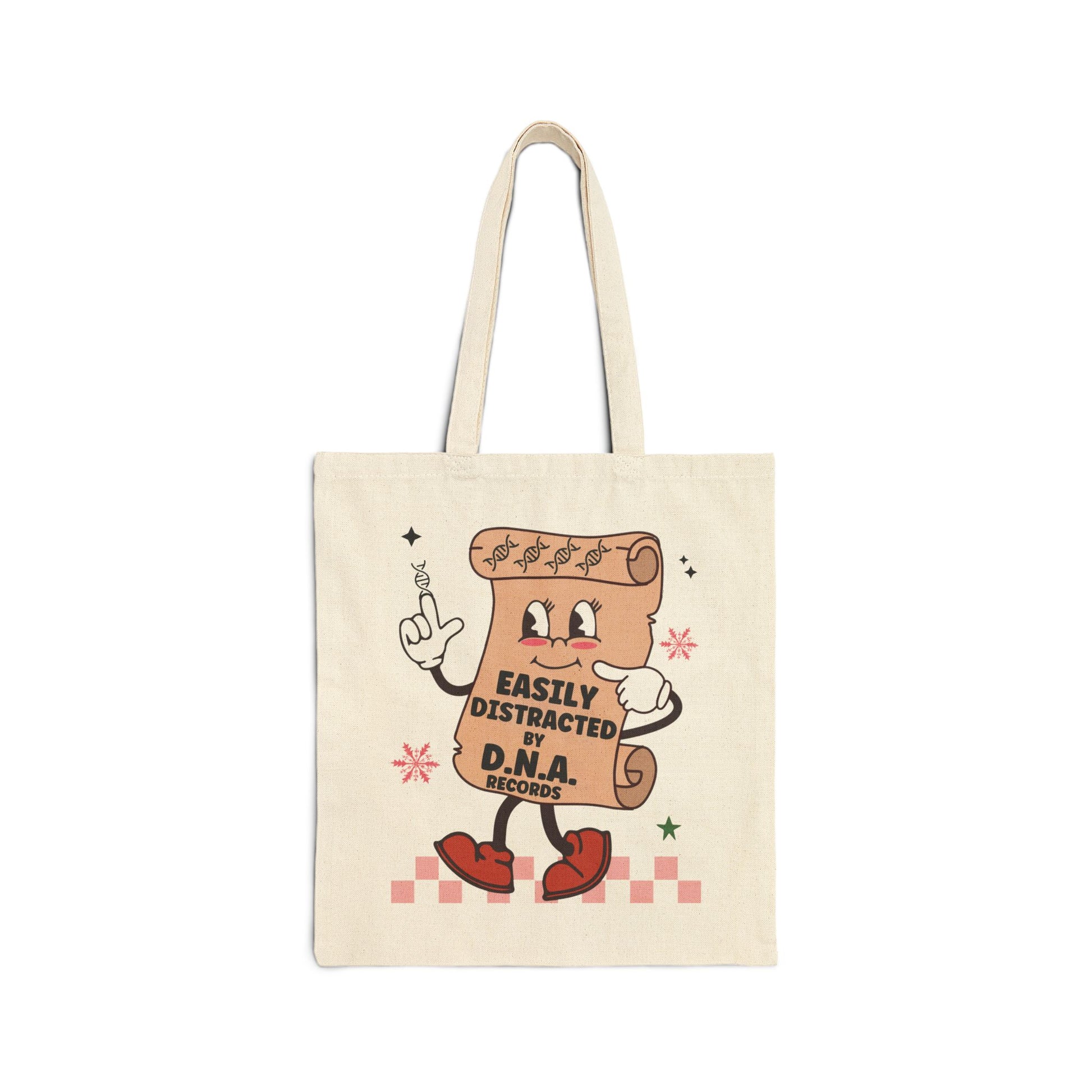 Show your DNA obsession with this playful scroll character tote featuring “Easily Distracted by D.N.A. Records.”