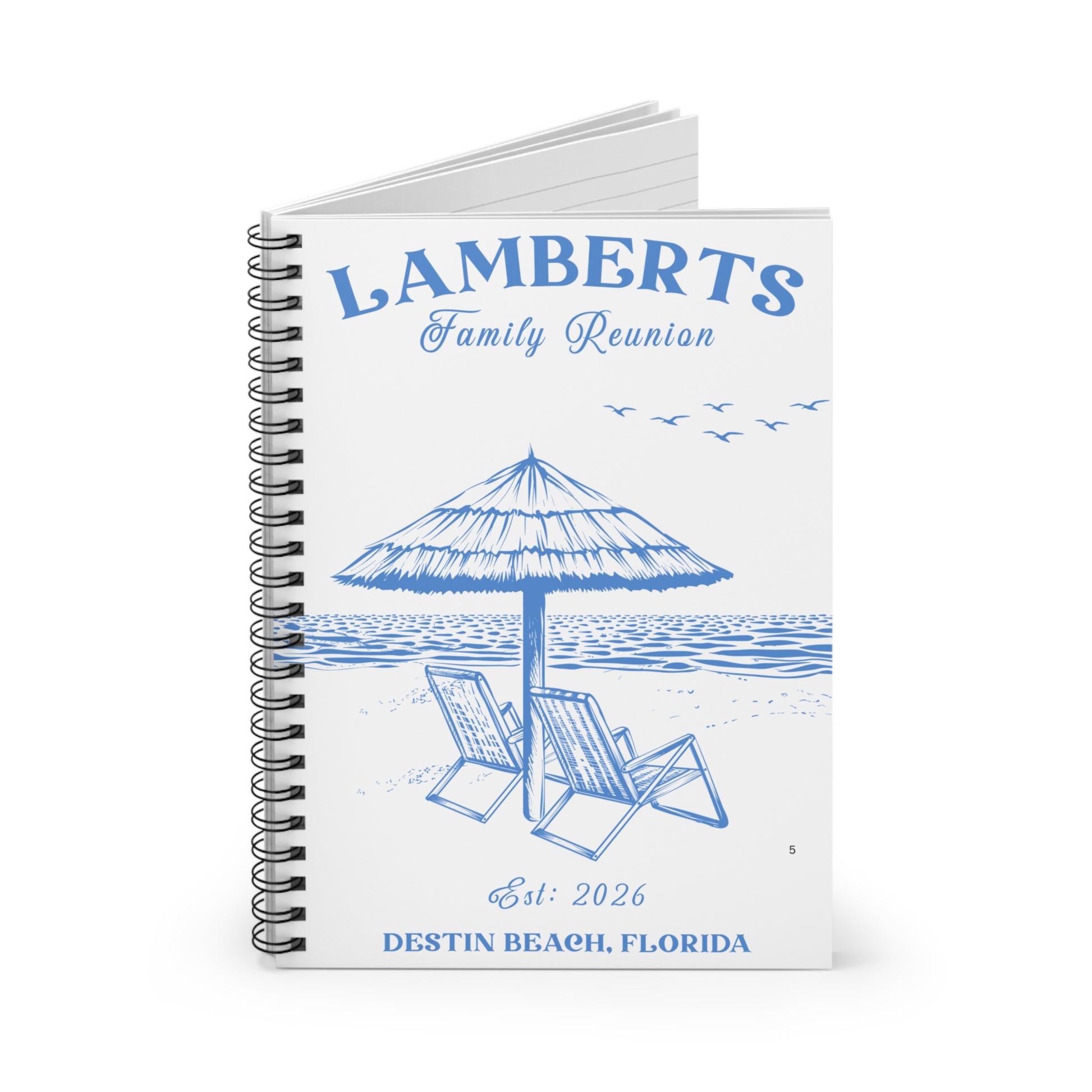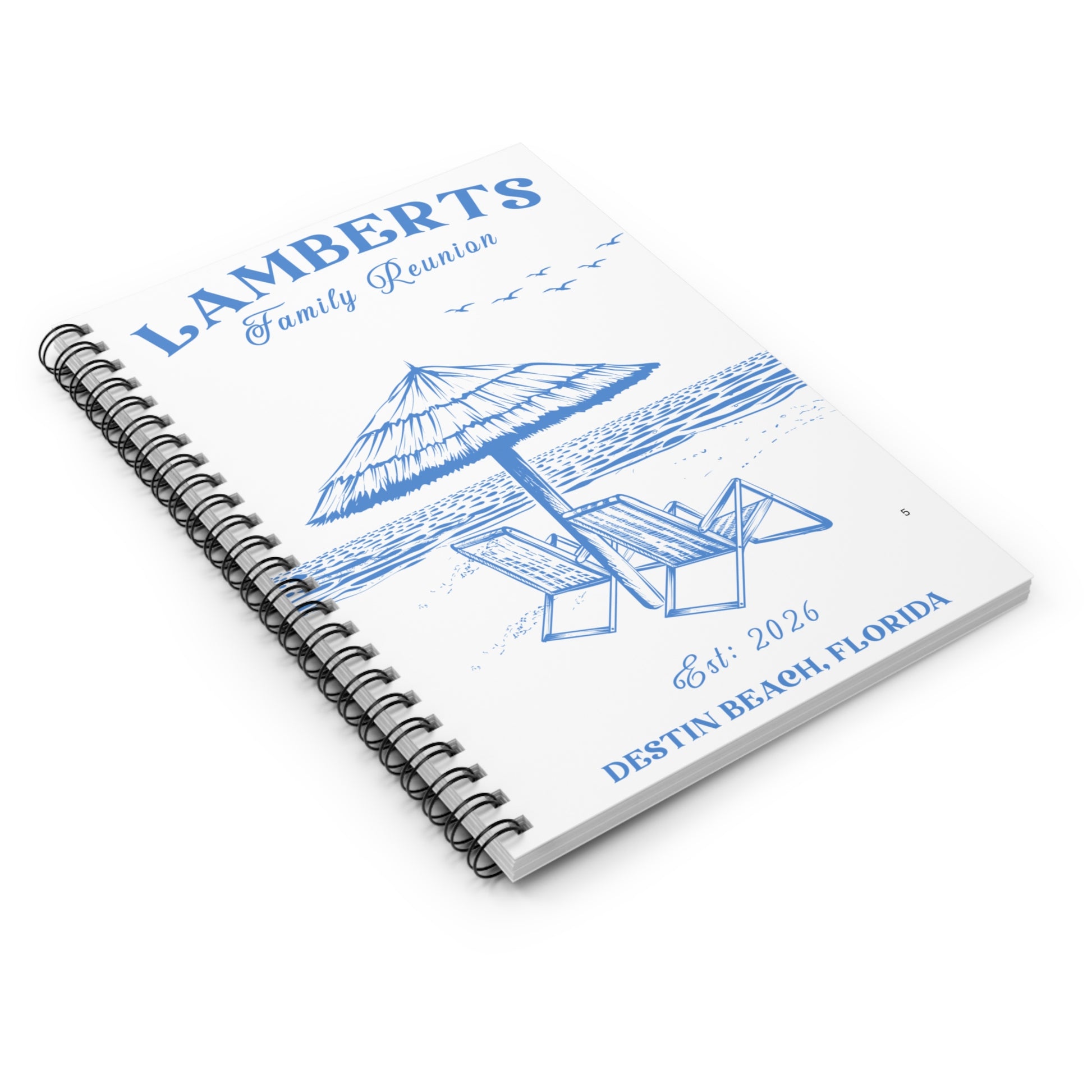 Capture the memories of your family reunion with this personalizedĀ spiral notebookĀ featuring a peaceful beach design with chairs and umbrella.