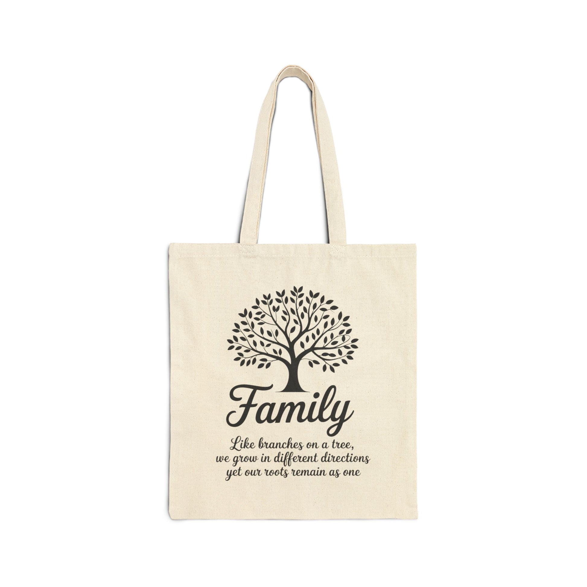 Carry your love of heritage with this Family Tree tote featuring the quote, “Like branches on a tree, we grow in different directions yet our roots remain as one.”