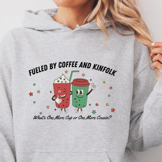 - The design features two cheerful coffee cups with the phrase “Fueled by Coffee and Kinfolk – What's One More Cup or One More Cousin?”