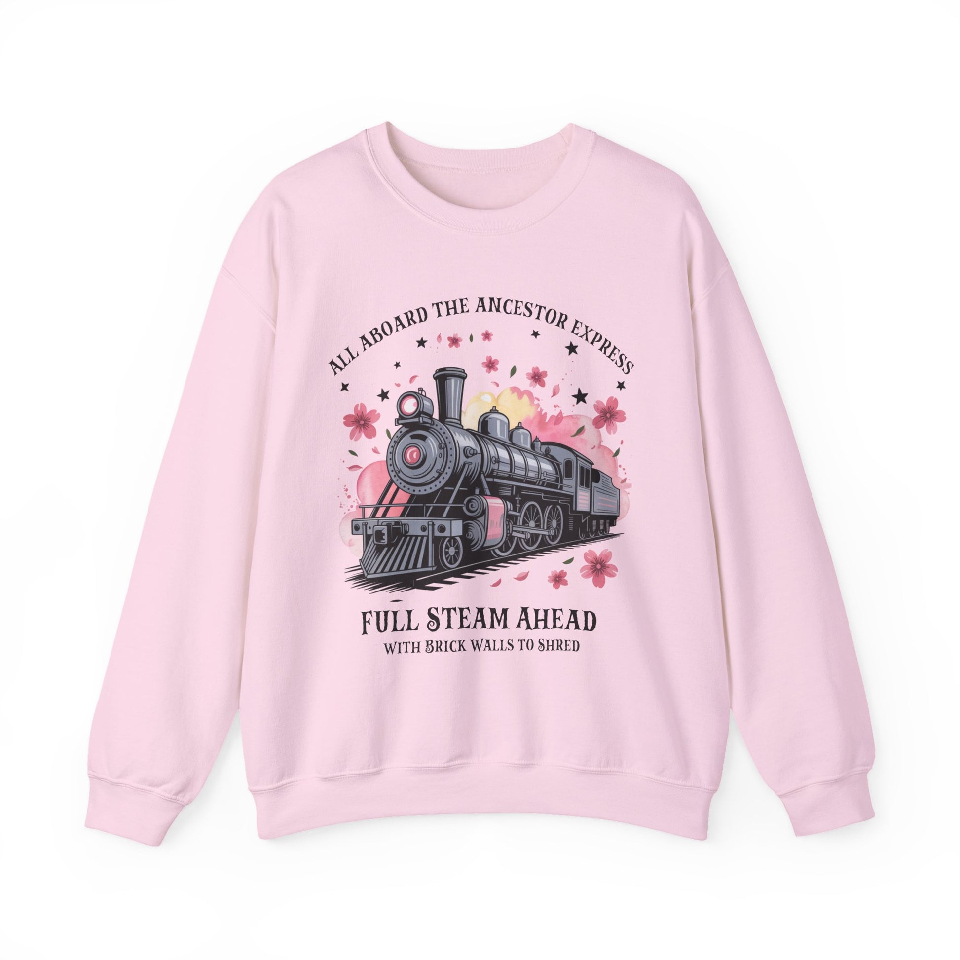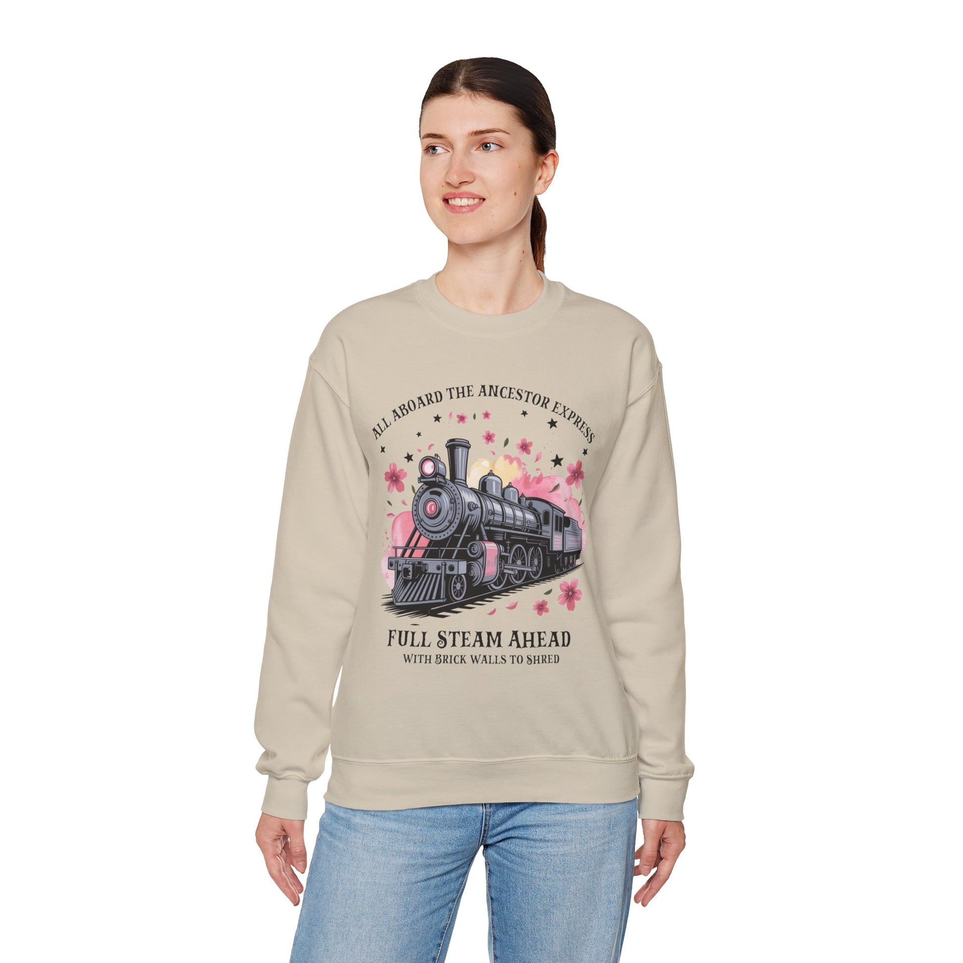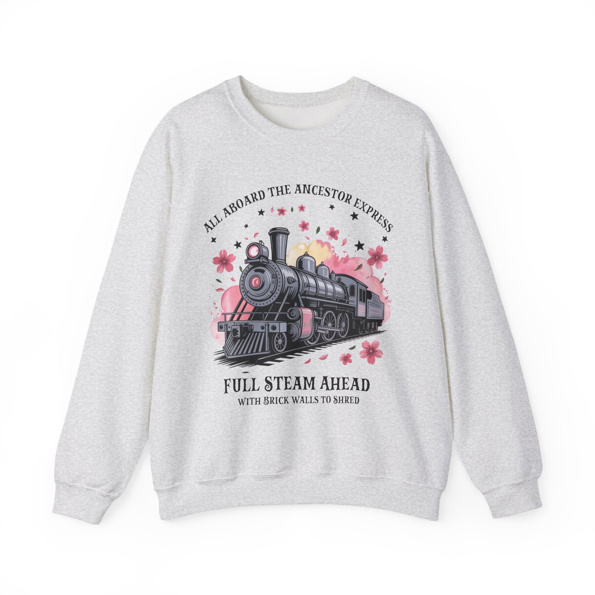 - This warm and comfy sweatshirt showcases: âAll Aboard the Ancestor Express â Full Steam Ahead with Brick Walls to Shredâ
