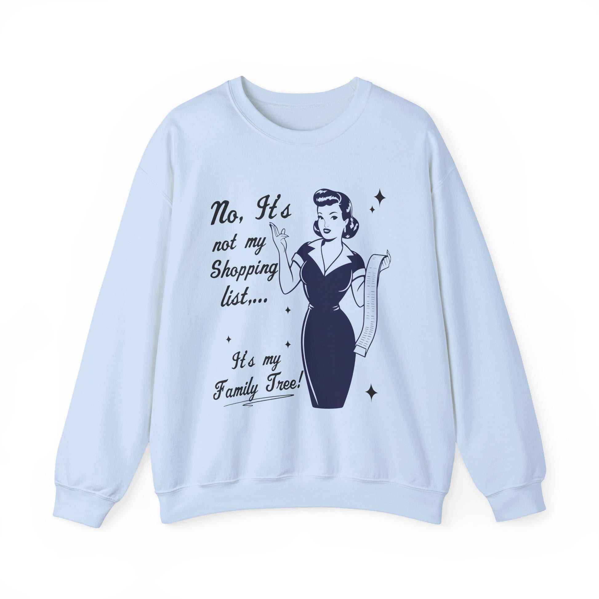 - Featuring a retro homemaker design and the funny phrase: “No, it’s not my Shopping List… It’s my Family Tree!” — this sweatshirt is the perfect mix of comfort and humor for family historians.