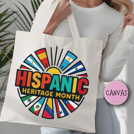 CelebrateĀ Hispanic Heritage MonthĀ in style with this bold and colorfulĀ tote bagĀ featuring a radiant sunburst surrounded by national flags.
