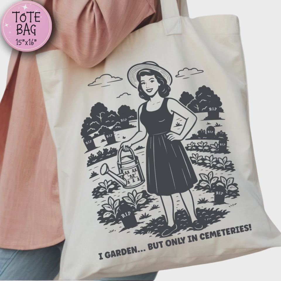 This tote bag features a retro gardener with the funny phrase “I Garden… But Only in Cemeteries!”—perfect for genealogists who love cemetery strolls and ancestor hunting.
