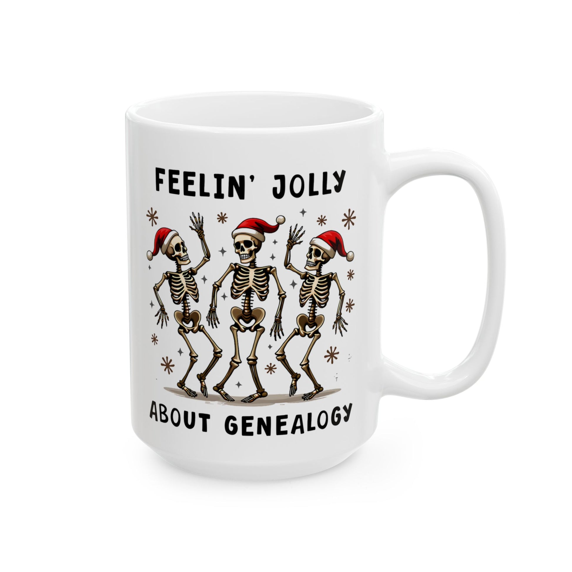 - Our “Feelin’ Jolly About Genealogy” mug features dancing skeletons and genealogical joy.