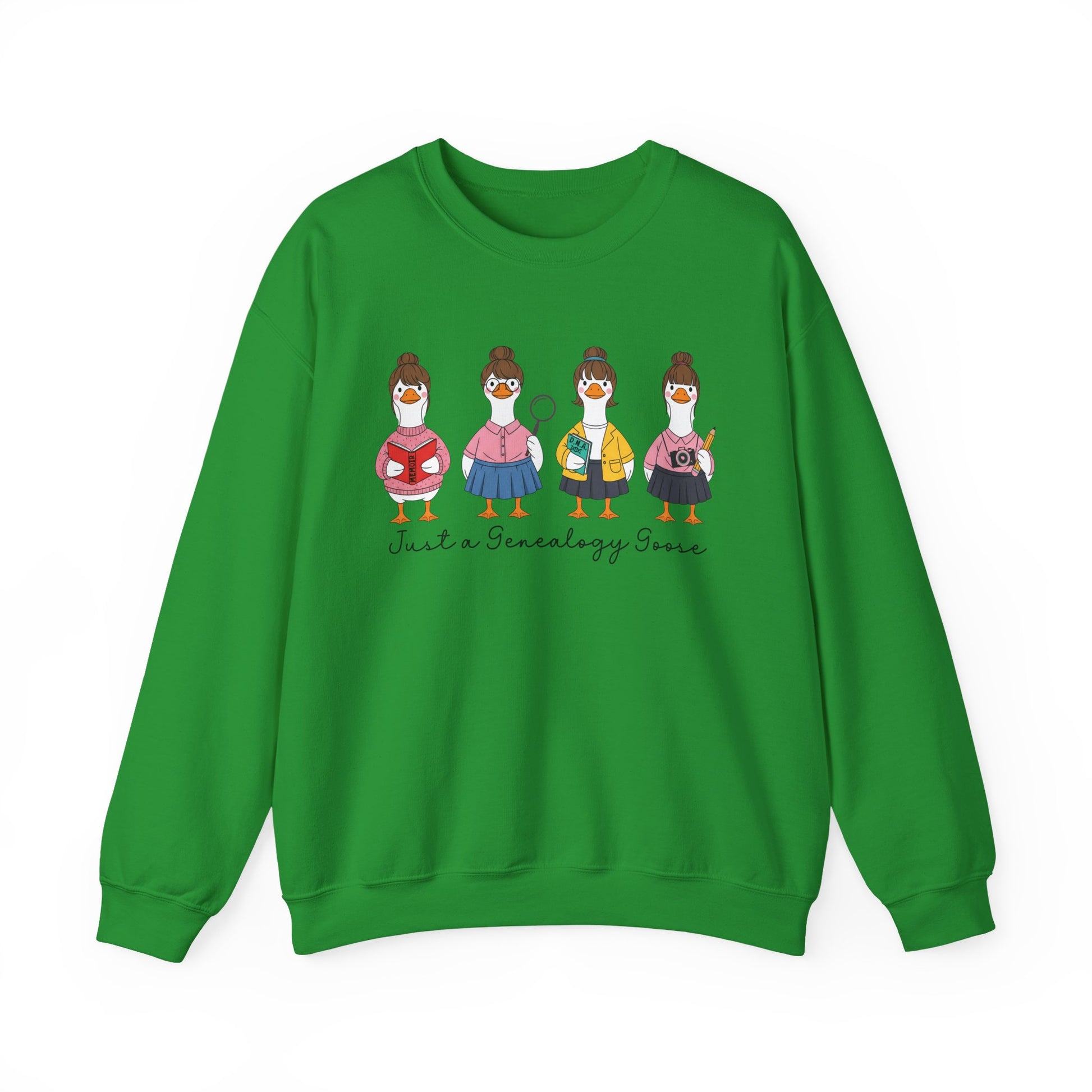 - This cozy crewneck features our delightful “Just a Genealogy Goose” squad—memoir-writing, DNA-testing, magnifying-glass-wielding geese who know how to track down roots in style.