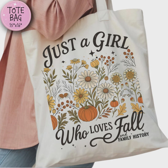 Show off your love for both autumn and ancestry with this “Just a Girl Who Loves Fall and Family History” tote bag.