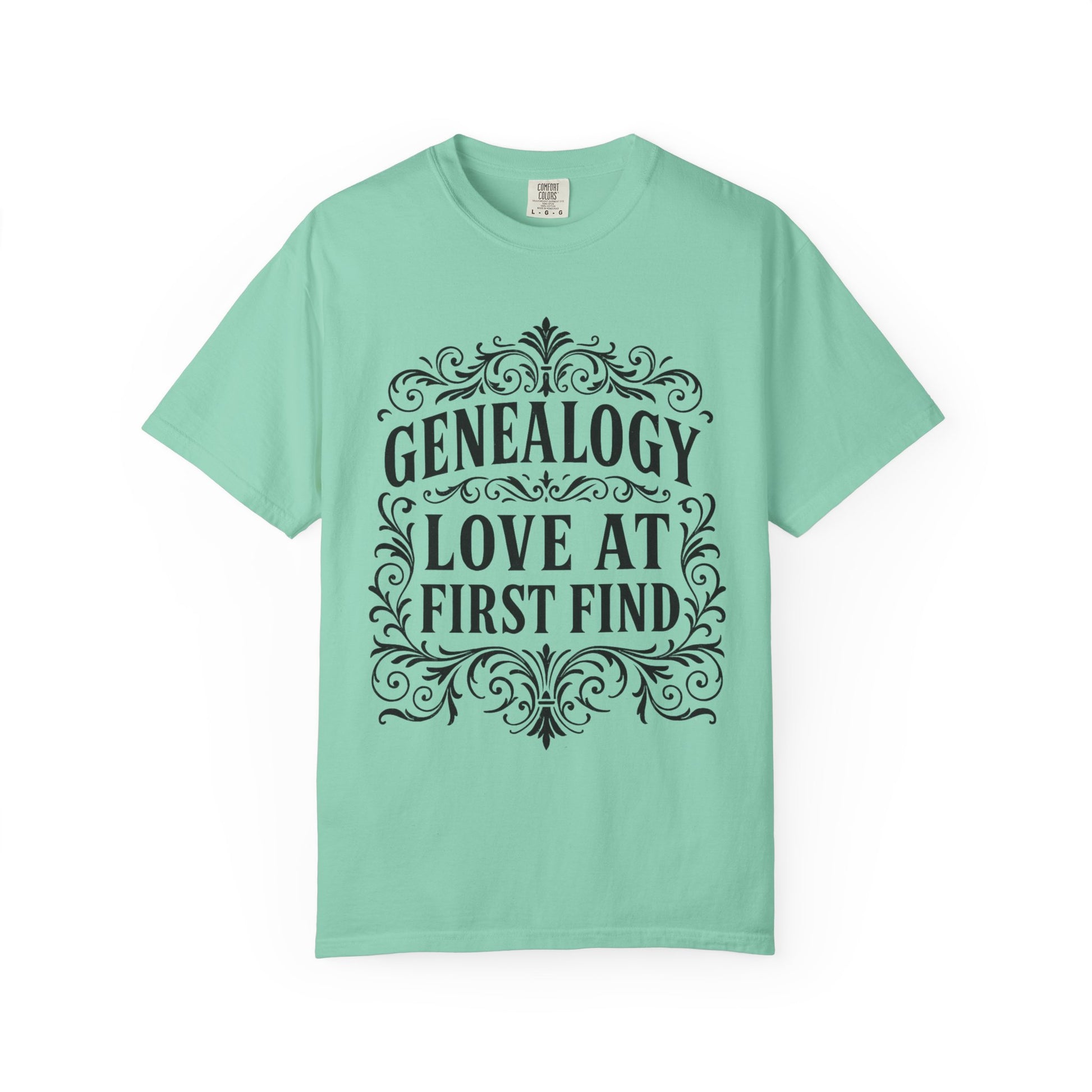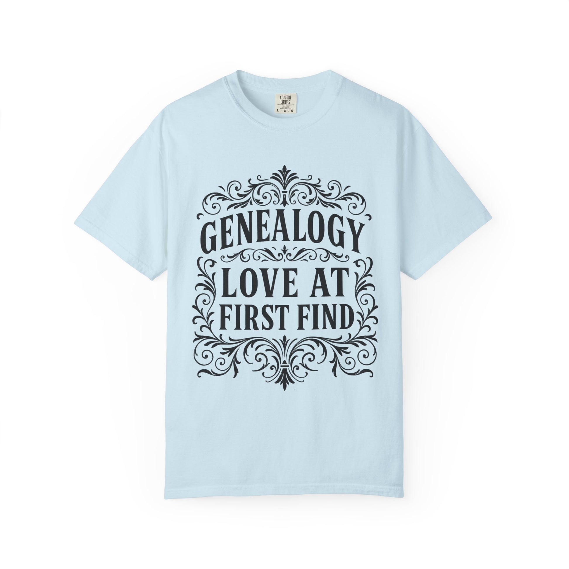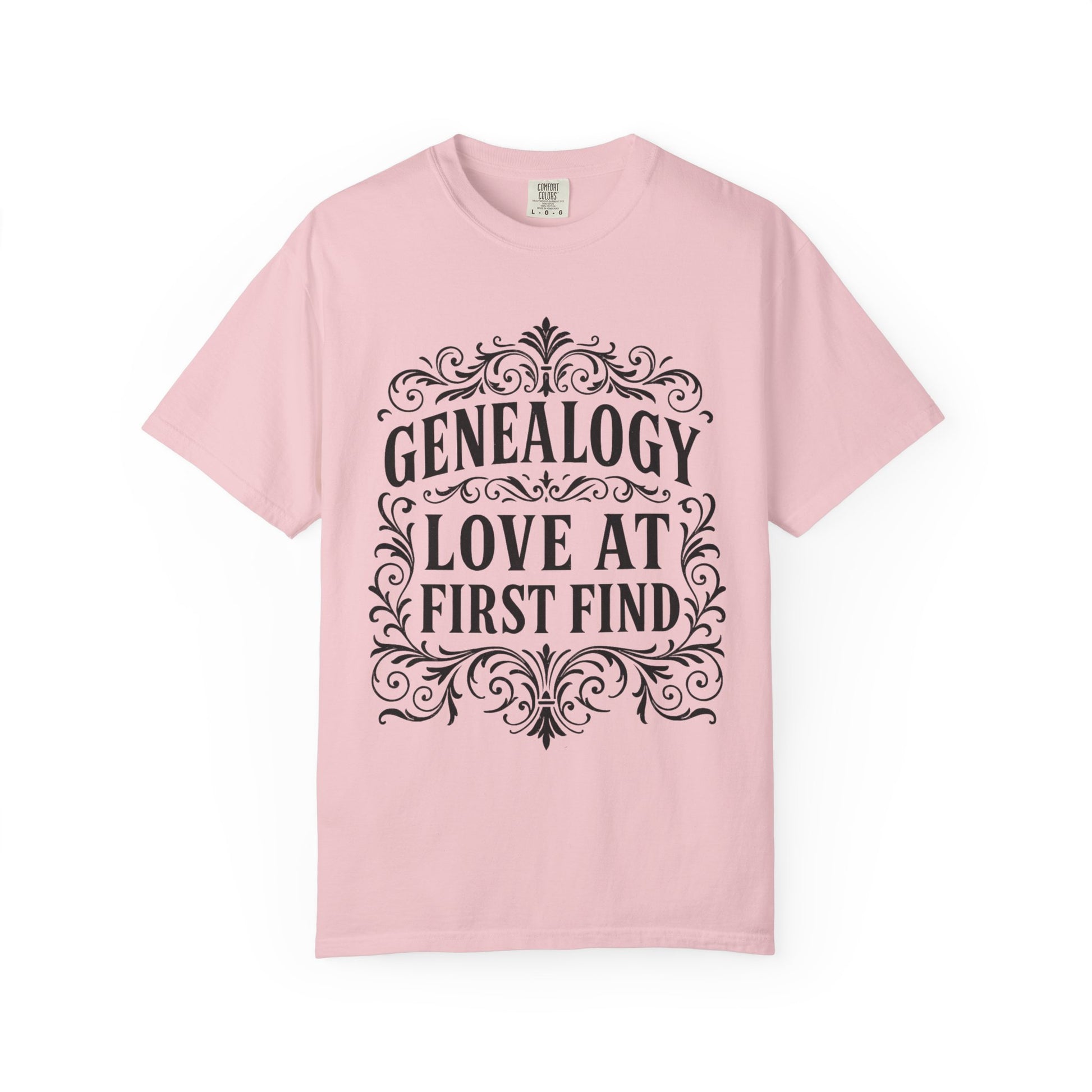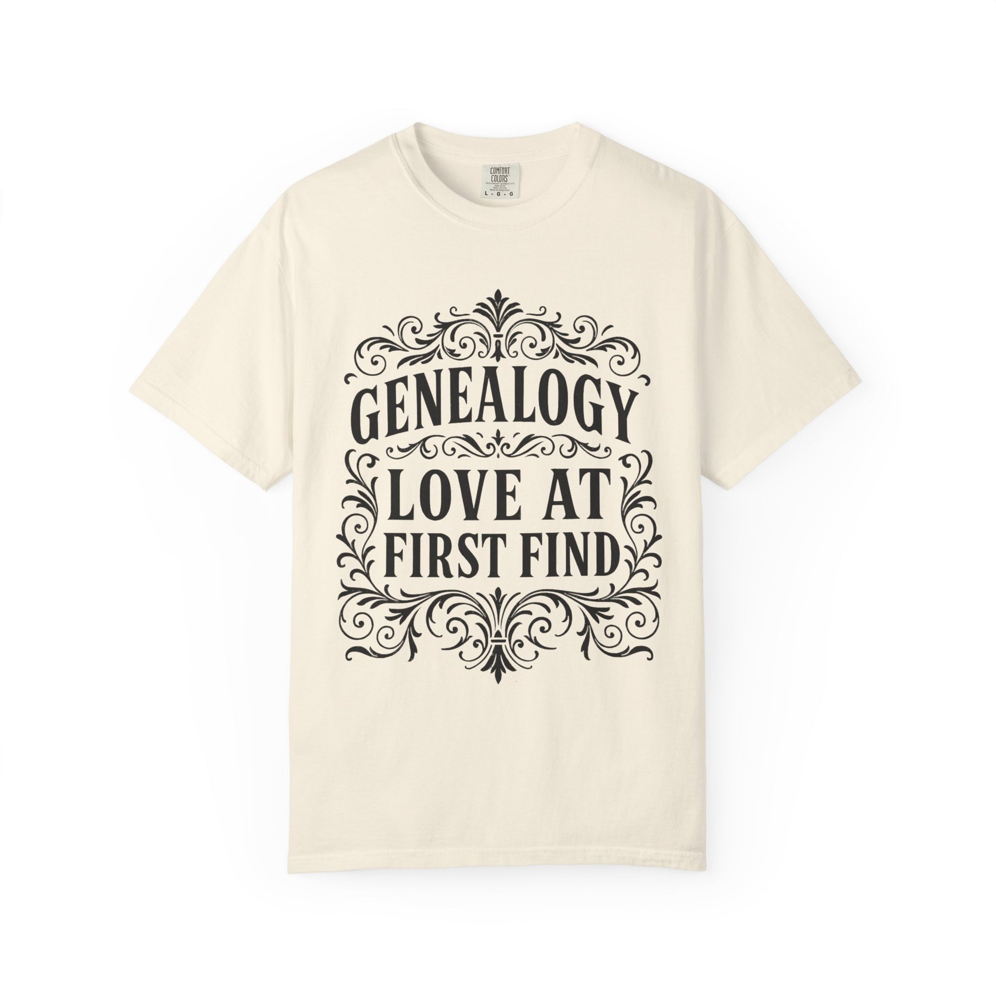 Celebrate your passion for family history with thisĀ Comfort Colors brand t-shirt featuring the ornate vintage design that says, Genealogy Love at First Find.