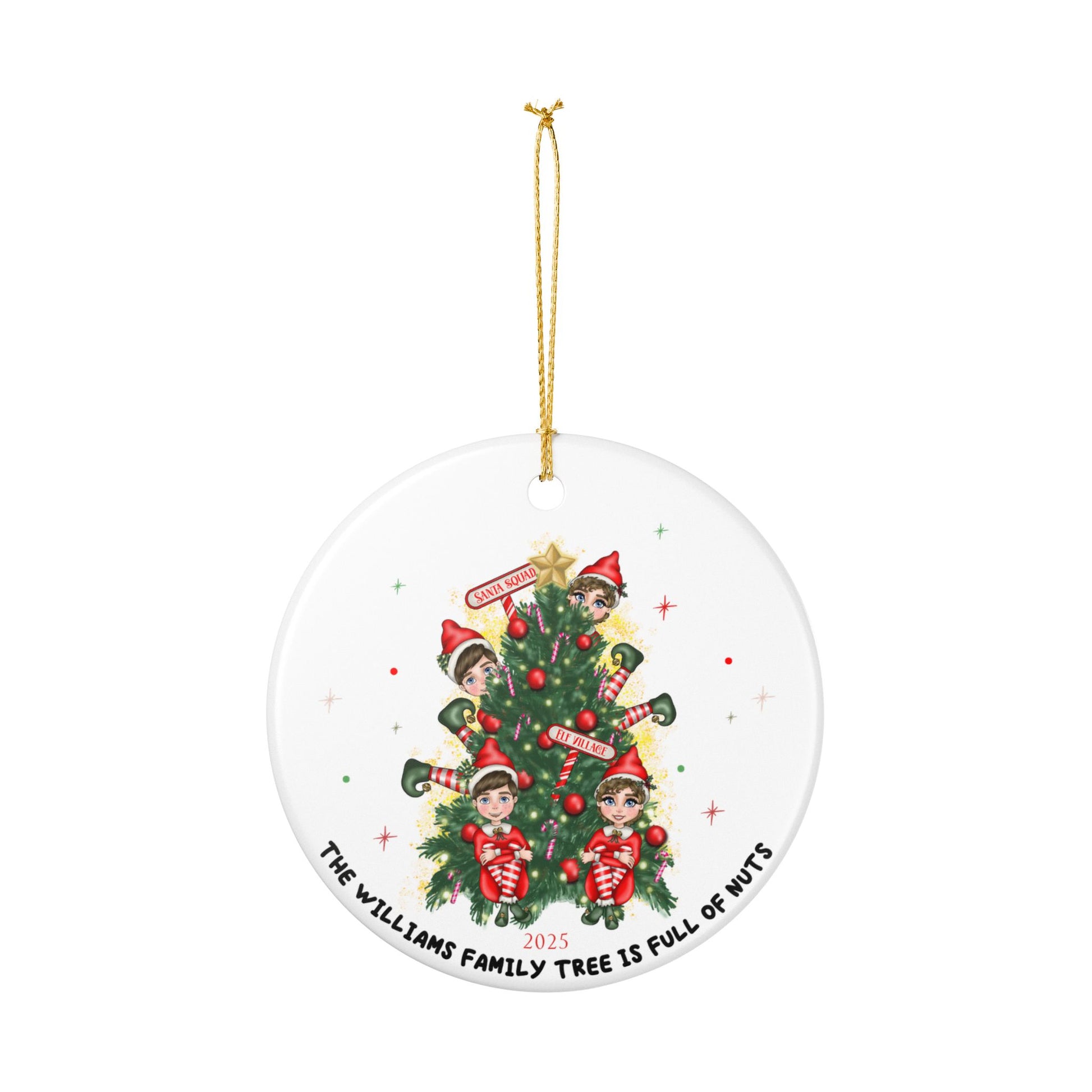 - Designed with playful elves peeking from a festive Christmas tree, it can be customized with your family name and year.