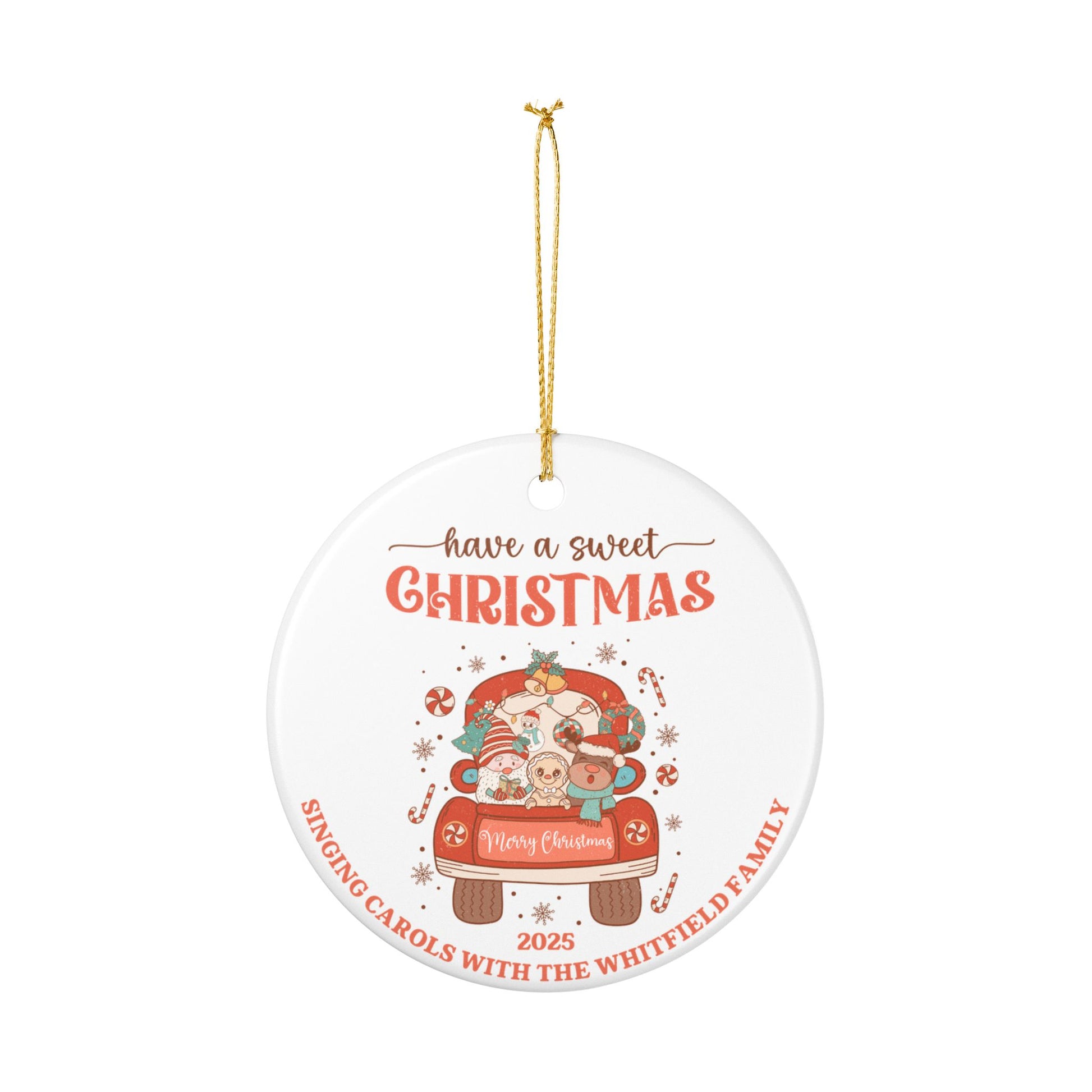 - Featuring a festive carol-singing design with Santa, reindeer, and holiday cheer, this ornament can be customized with your family name and year.