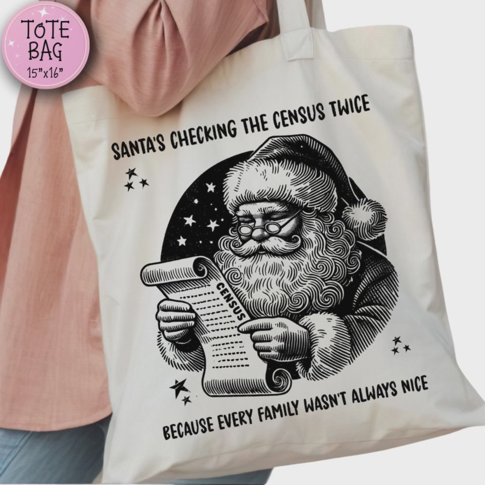 Add some festive fun to your family history with our unique Tote Bag, featuring a vintage-style Santa holding a census list and a cheeky phrase.