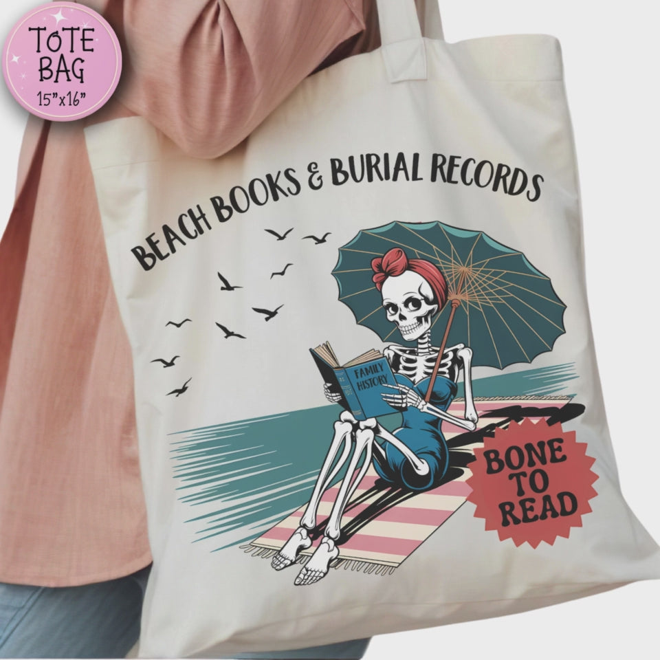 Carry your notebooks, records, or library hauls in style with this witty “Bone to Read” genealogy tote bag!