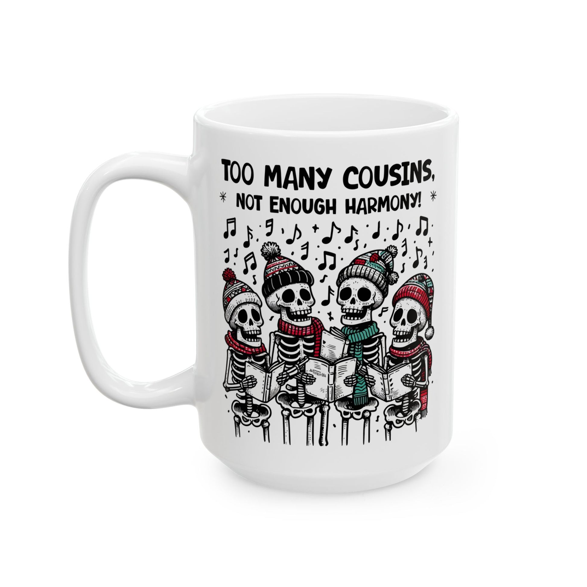 - This hilarious “Too Many Cousins, Not Enough Harmony” design features a choir of skeletons in winter hats, singing their off-key hearts out.