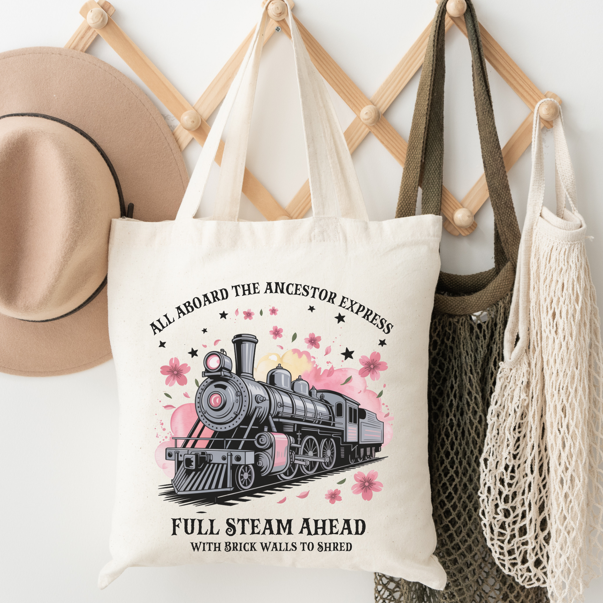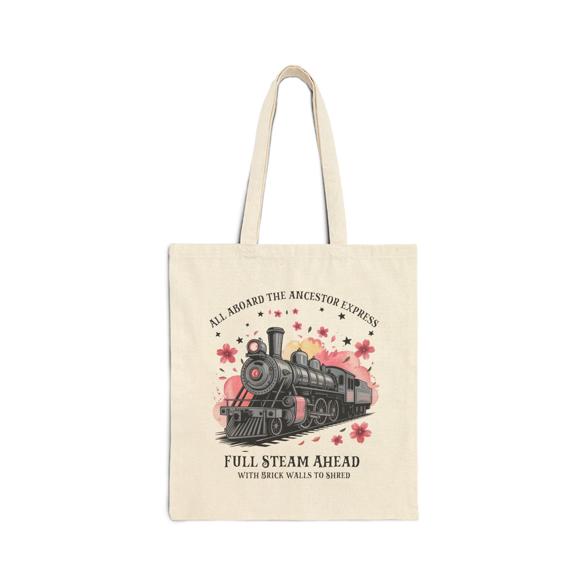 - This sturdy canvas tote features: âAll Aboard the Ancestor Express â Full Steam Ahead with Brick Walls to Shredâ