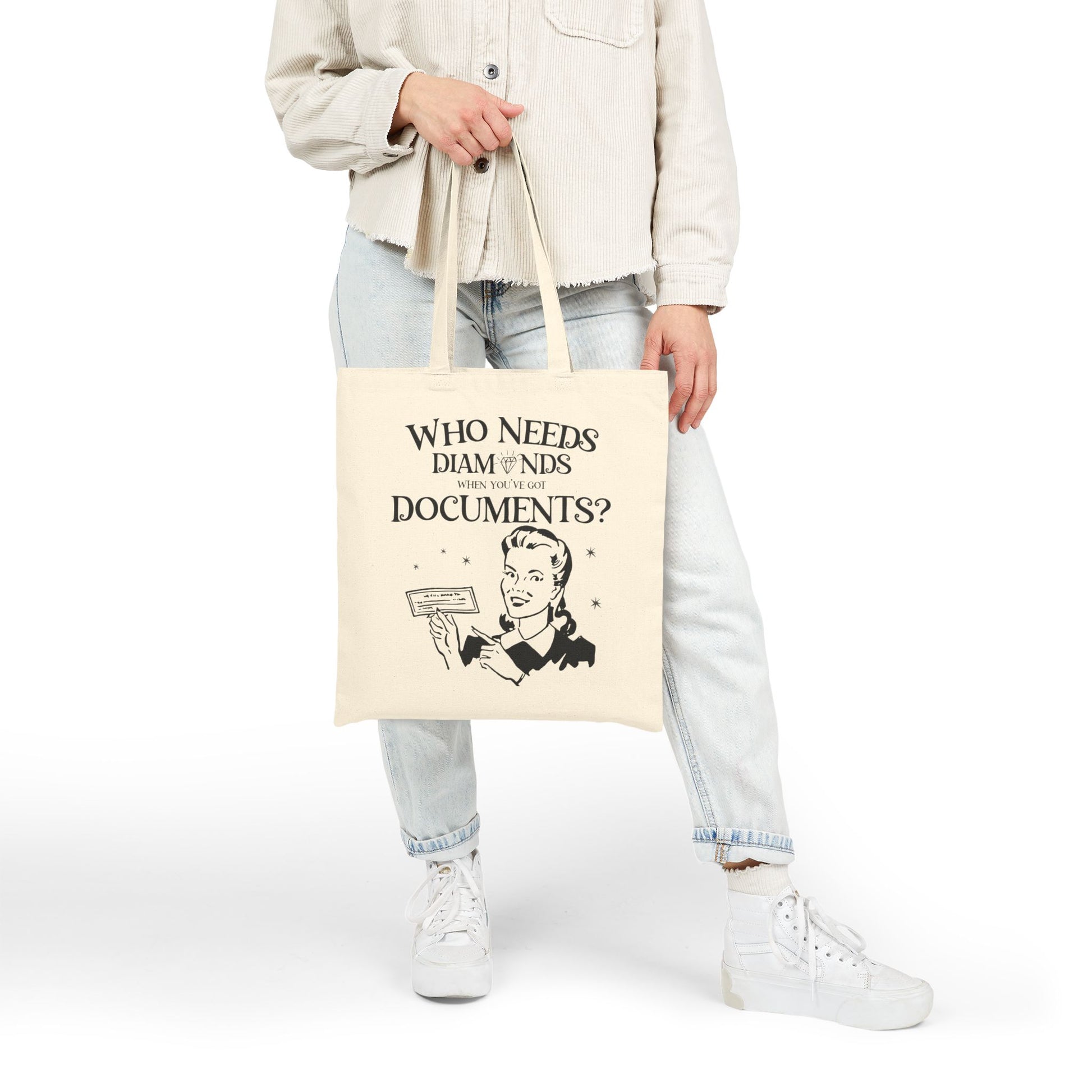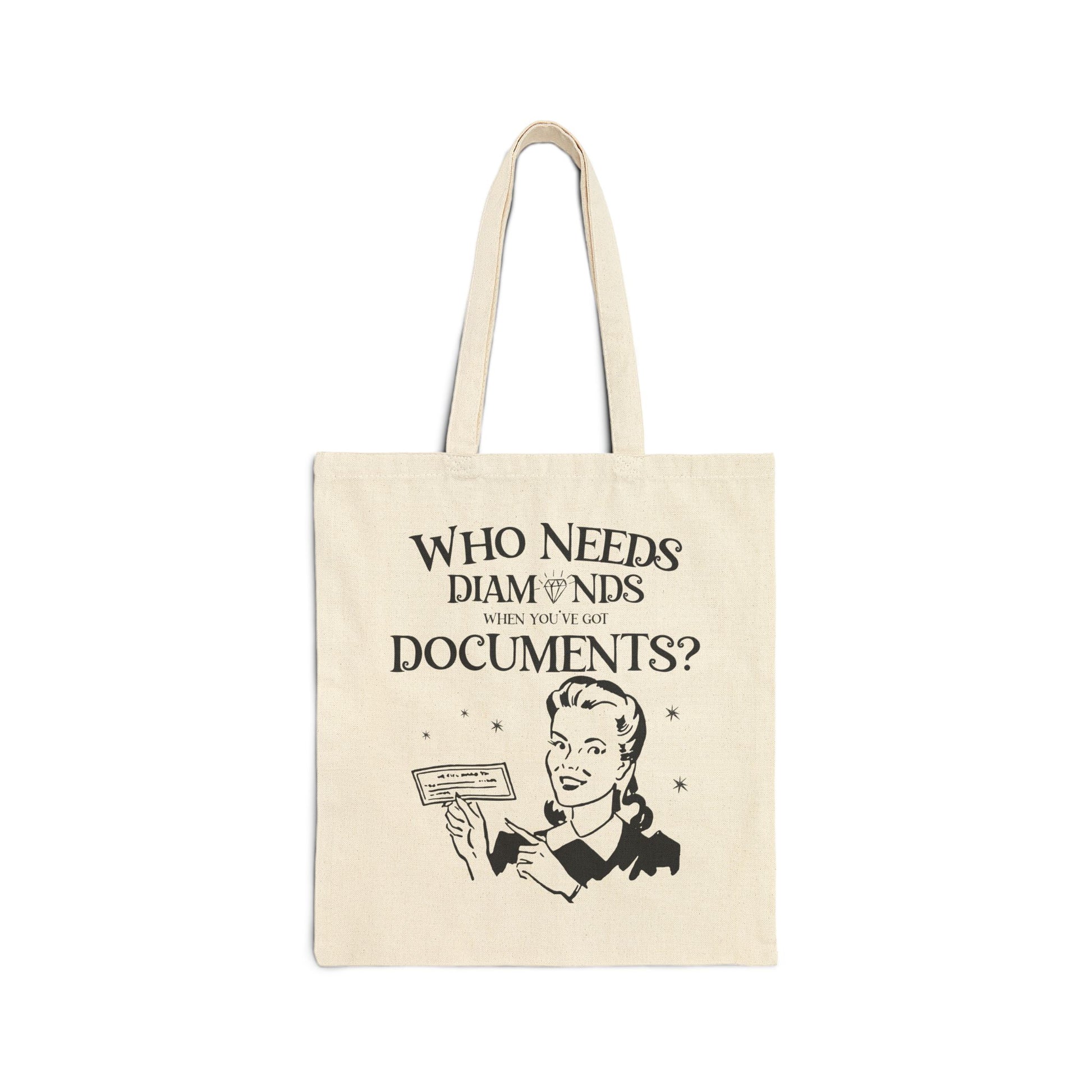- Featuring the witty phrase “Who Needs Diamonds When You’ve Got Documents?”, this bag is perfect for family historians, ancestry researchers, and document hunters who know that vital records are worth more than jewels.